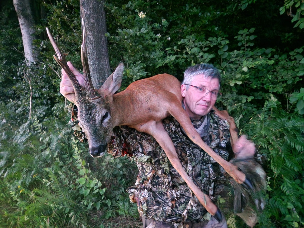 Après 10 ans d'attente et de persévérance Fred prélève à l'affut du soir un magnifique Brocard.